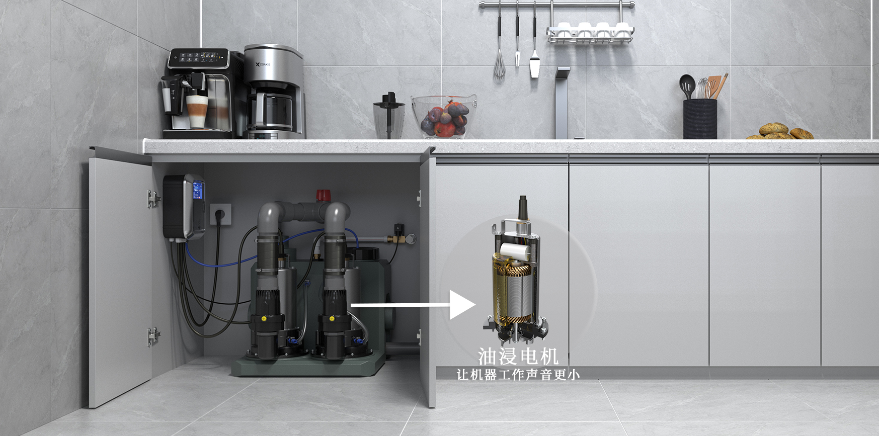 其運行原理和傳統的污水提升泵是一樣的,在水位上升達到啟動液位后,機器自動啟動排水,水位下降到停止液位就會停止工作,但是在電機的運用和構造上做了升級,采用S1的電機制式,讓機器可以連續地運作,就算頻繁的啟動也不會有什么問題,再加上采用油冷的電機,讓礦物質油充滿整個電機內部,在給電機降溫的同時還能吸收噪音,讓機器可以做到靜音運行。