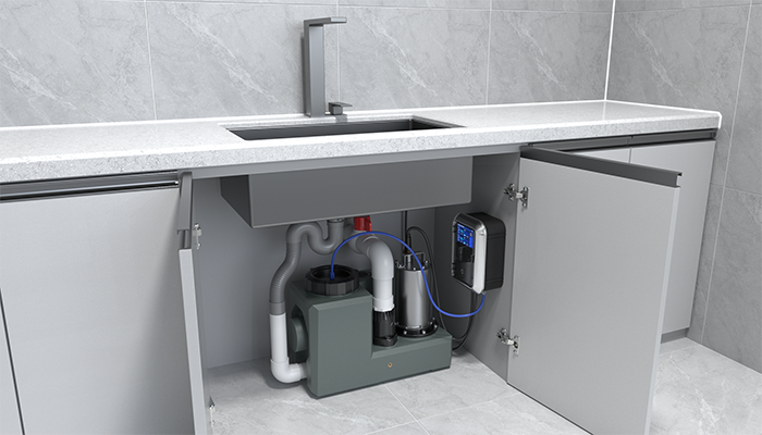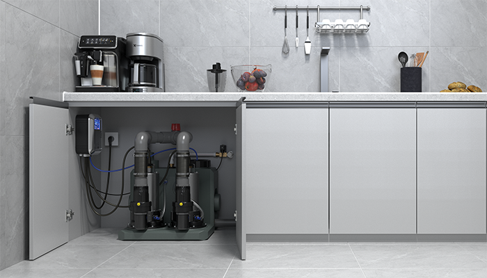地下室水吧臺怎么排水?新增茶水間排水解決辦法,智流智能提升泵,S1制式油冷電機,智能反清洗,實時聯網監測告警,地下室排水無憂!