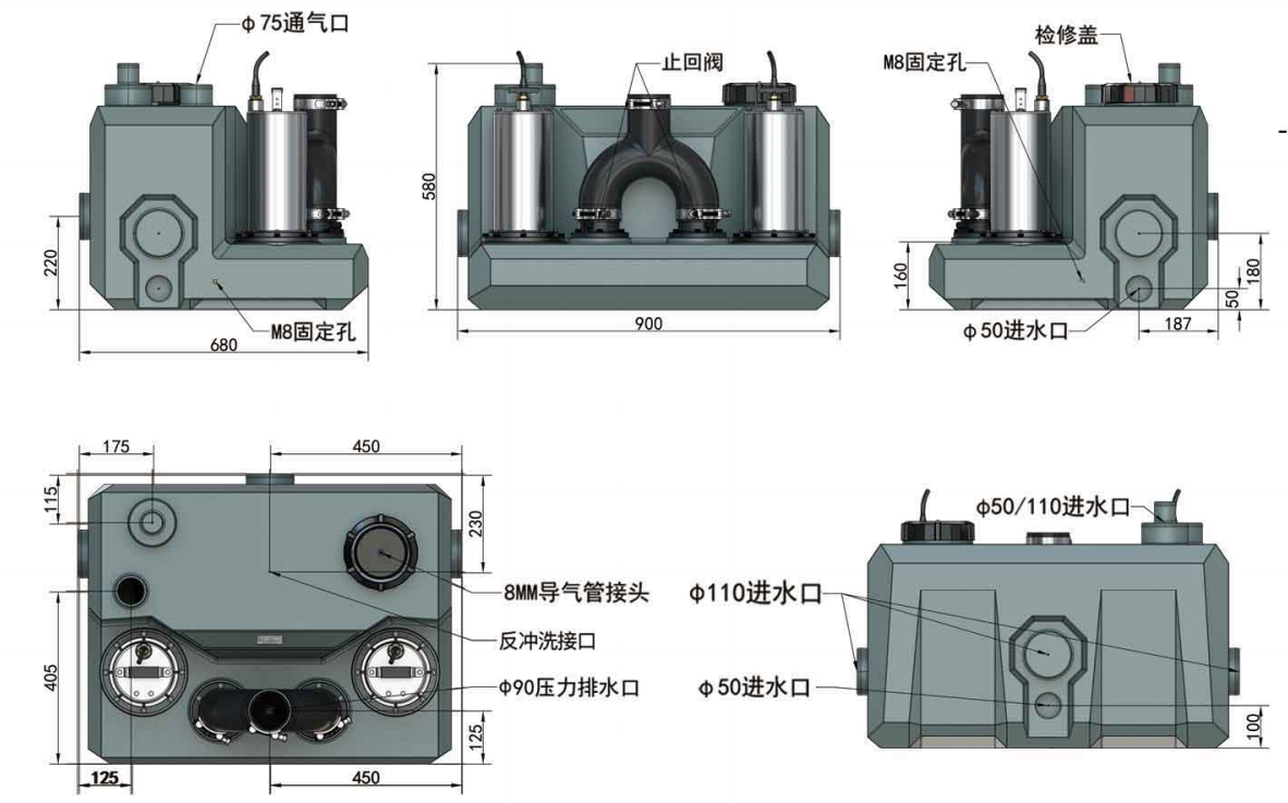 · 入水口:3×φ110,3×φ50,1×φ50/110